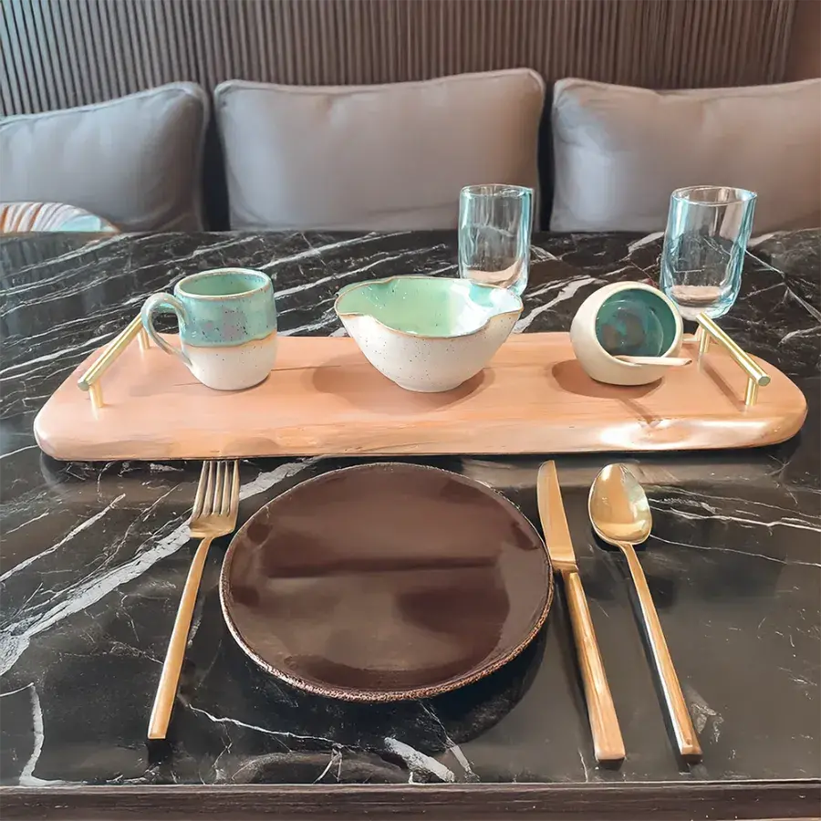 Ce plateau est travaillé avec soin : sélection du bois, mise en forme manuelle, arrondis délicats, finitions satinées et pose de poignées métalliques au design épuré. Cette pièce unique est un objet décoratif à part entière, pensé pour accompagner vos moments du quotidien comme vos instants d’exception.