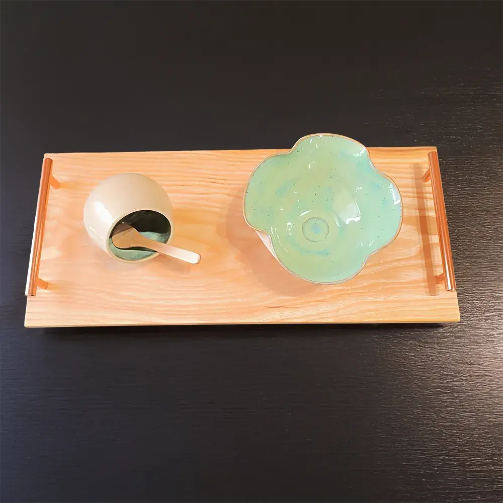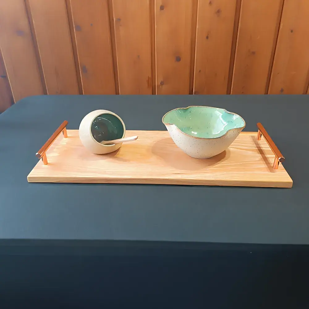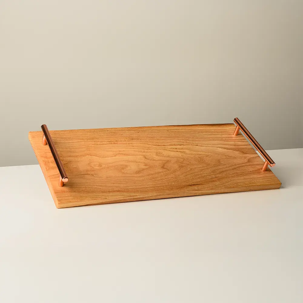 Les poignées en métal cuivré sont à la fois modernes et raffinées. Elles apportent une note lumineuse qui contraste harmonieusement avec la douceur du bois. Et offrent une excellente prise en main tout en sublimant le design général du plateau.