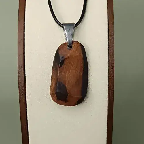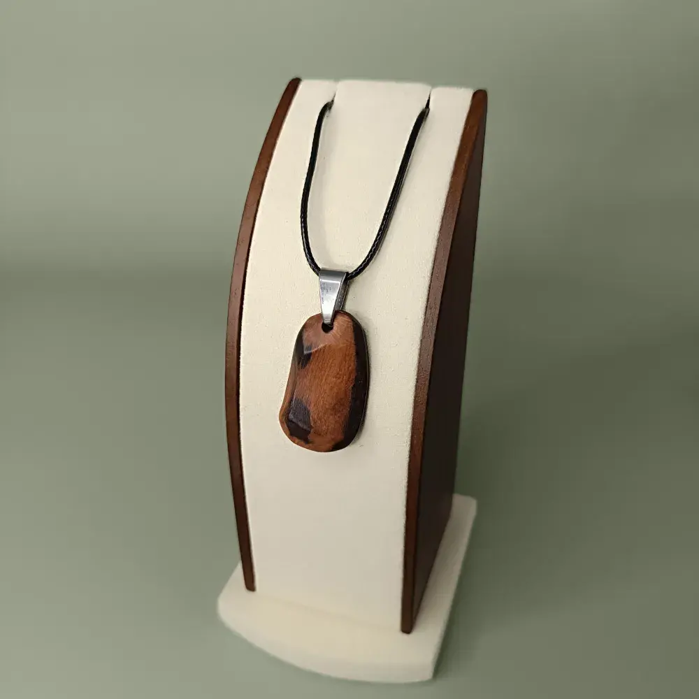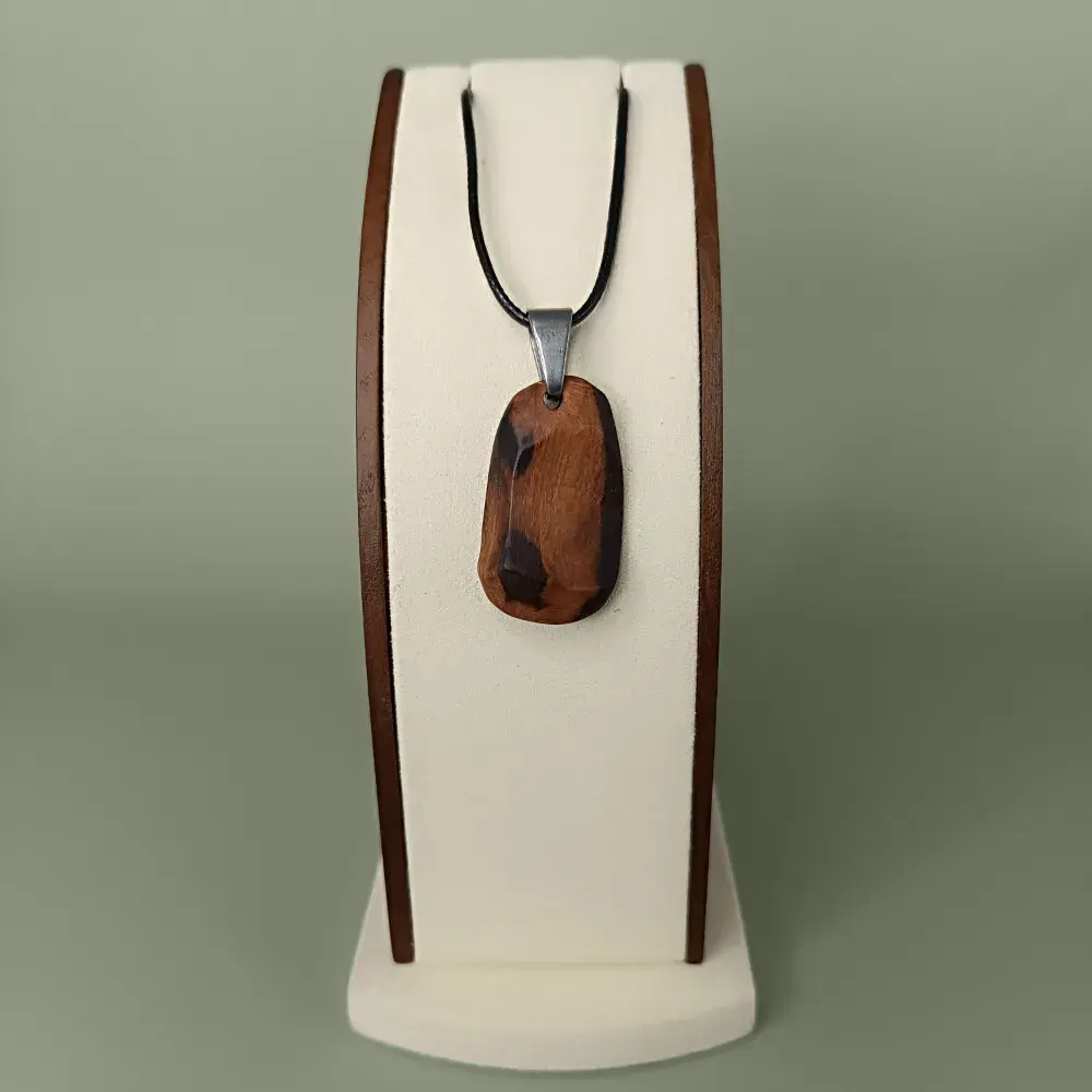 Ce pendentif se distingue par son caractère brut et ses nuances naturelles, témoins d’un long voyage au fil de l’eau. Nous sculptons et ponçons le bois à la main, ce qui permet de conserver ses singularités, ses veinures et ses contrastes qui en font un bijou unique.