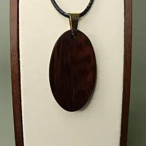 « Lueur Nocturne » évoque la profondeur et le caractère du bois d’Amourette. Ses nuances chocolatées, parsemées de veinages plus clairs, apportent du relief et une texture naturelle à ce pendentif ovale.