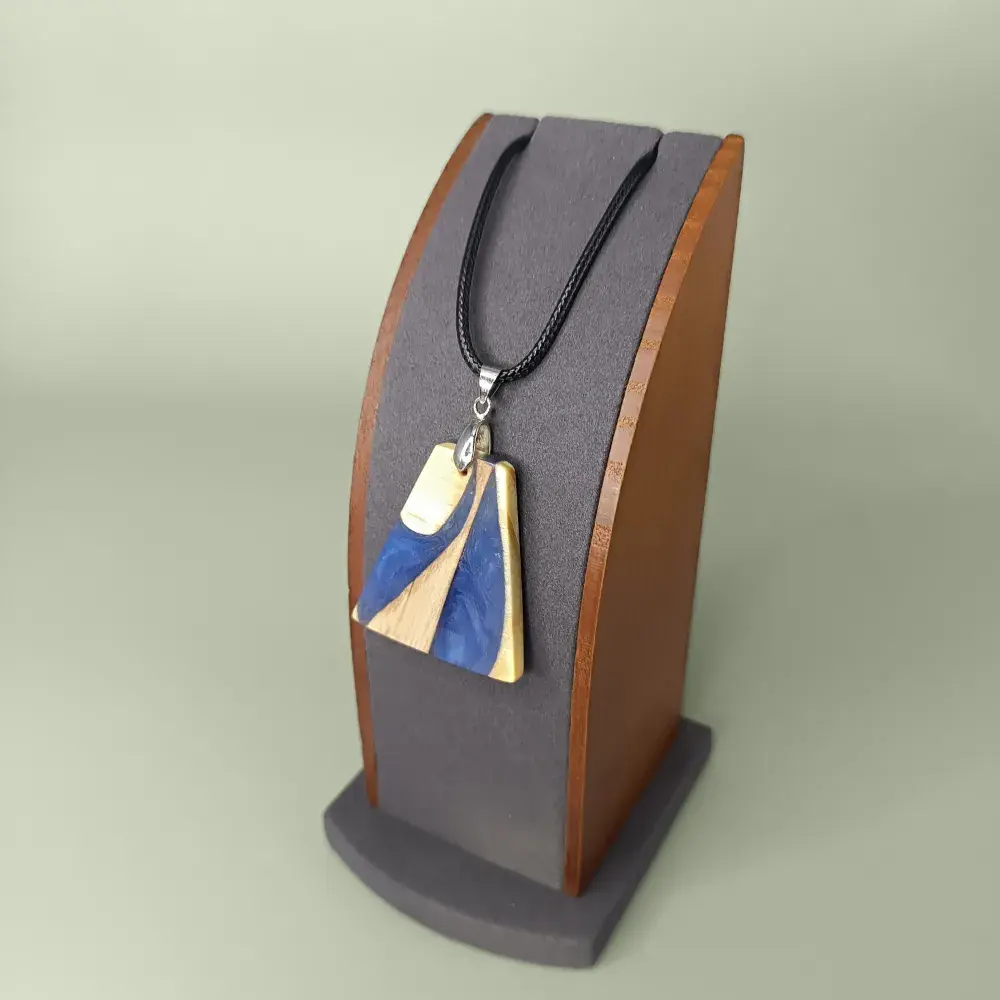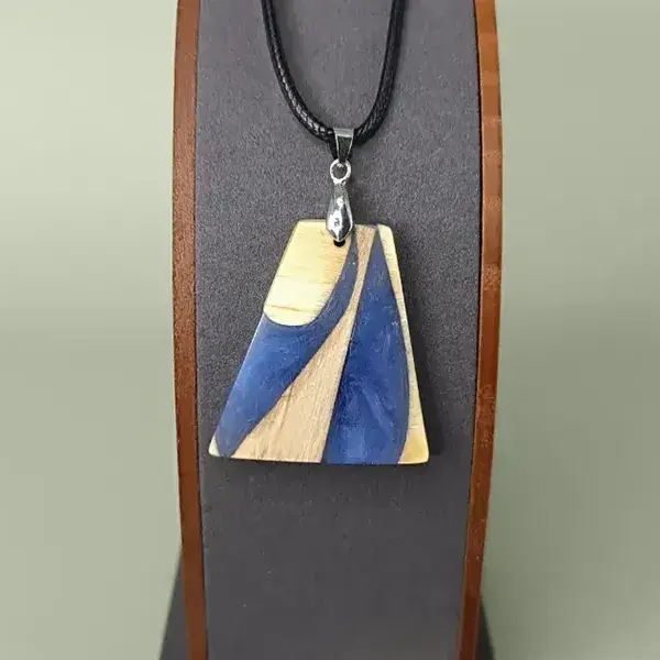 Ce pendentif en bois et résine bleue joue sur les oppositions subtiles entre matières et couleurs, offrant une présence visuelle forte sans jamais être ostentatoire.