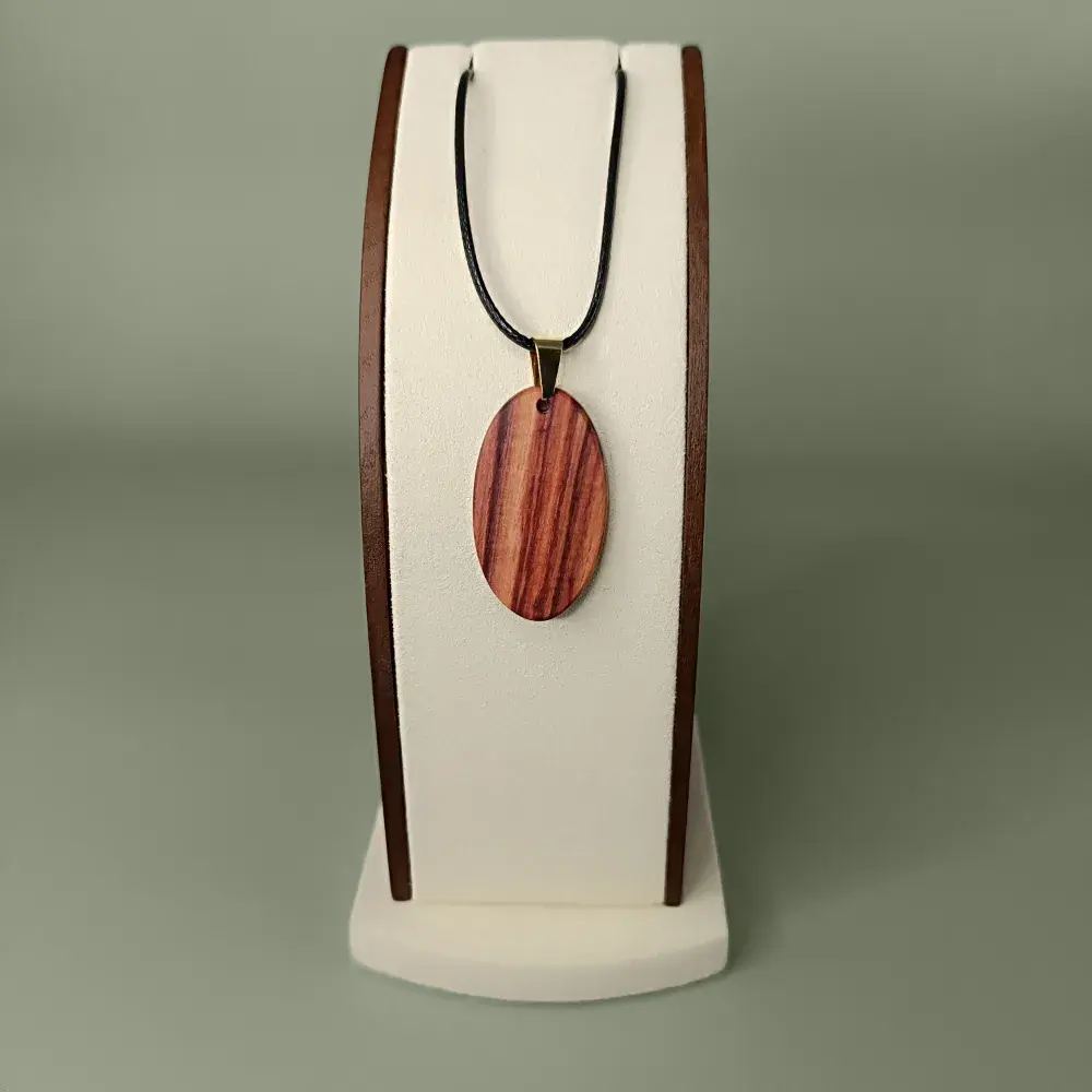 Nous appliquons une huile qui protège et intensifie la profondeur des couleurs. Le pendentif devient doux au toucher et les nuances du bois semblent vivantes, presque changeantes selon la lumière et l’angle de vue. Chaque mouvement révèle un détail subtil qui fait de chaque pièce un bijou vivant, élégant et plein de caractère.